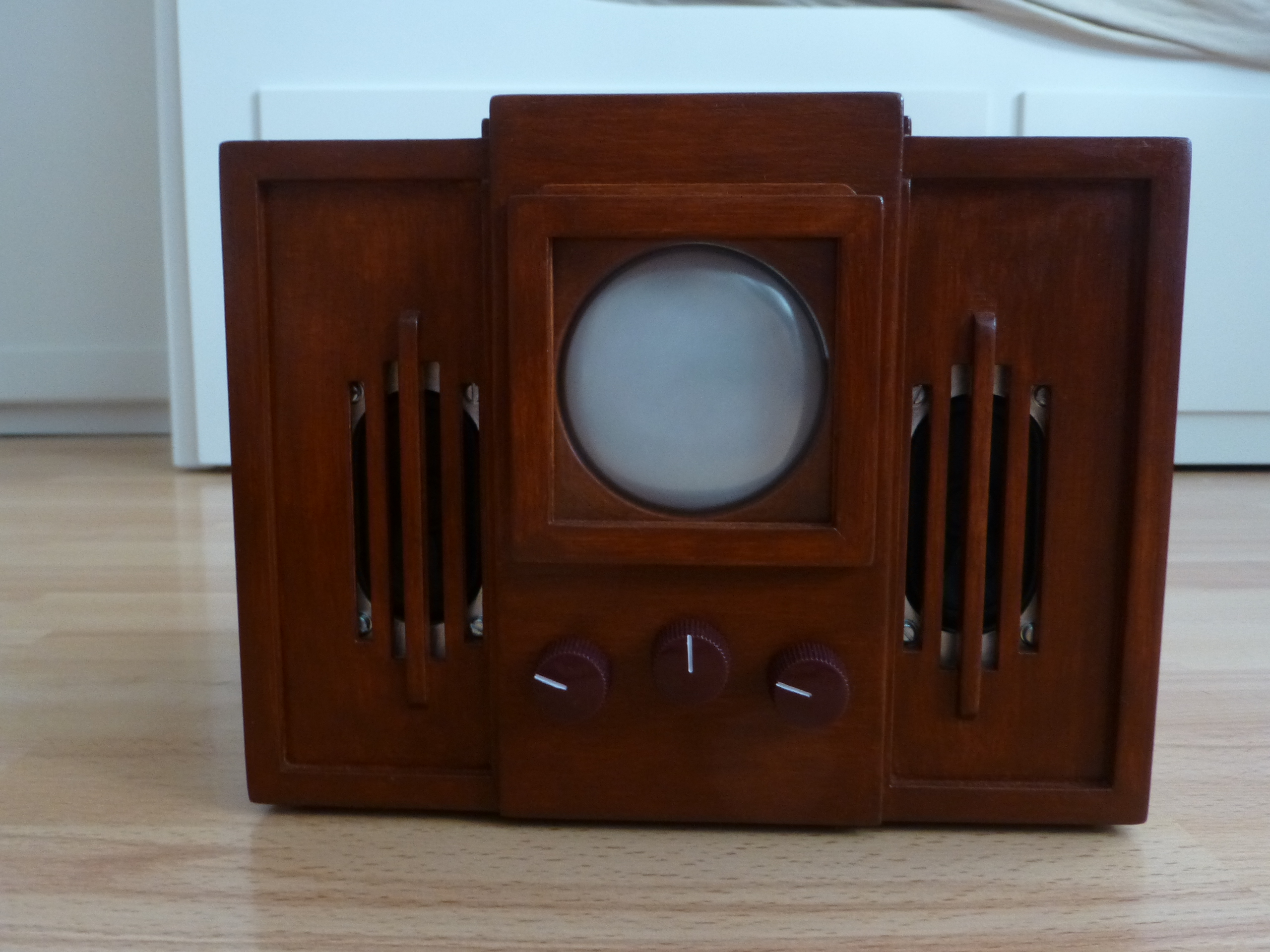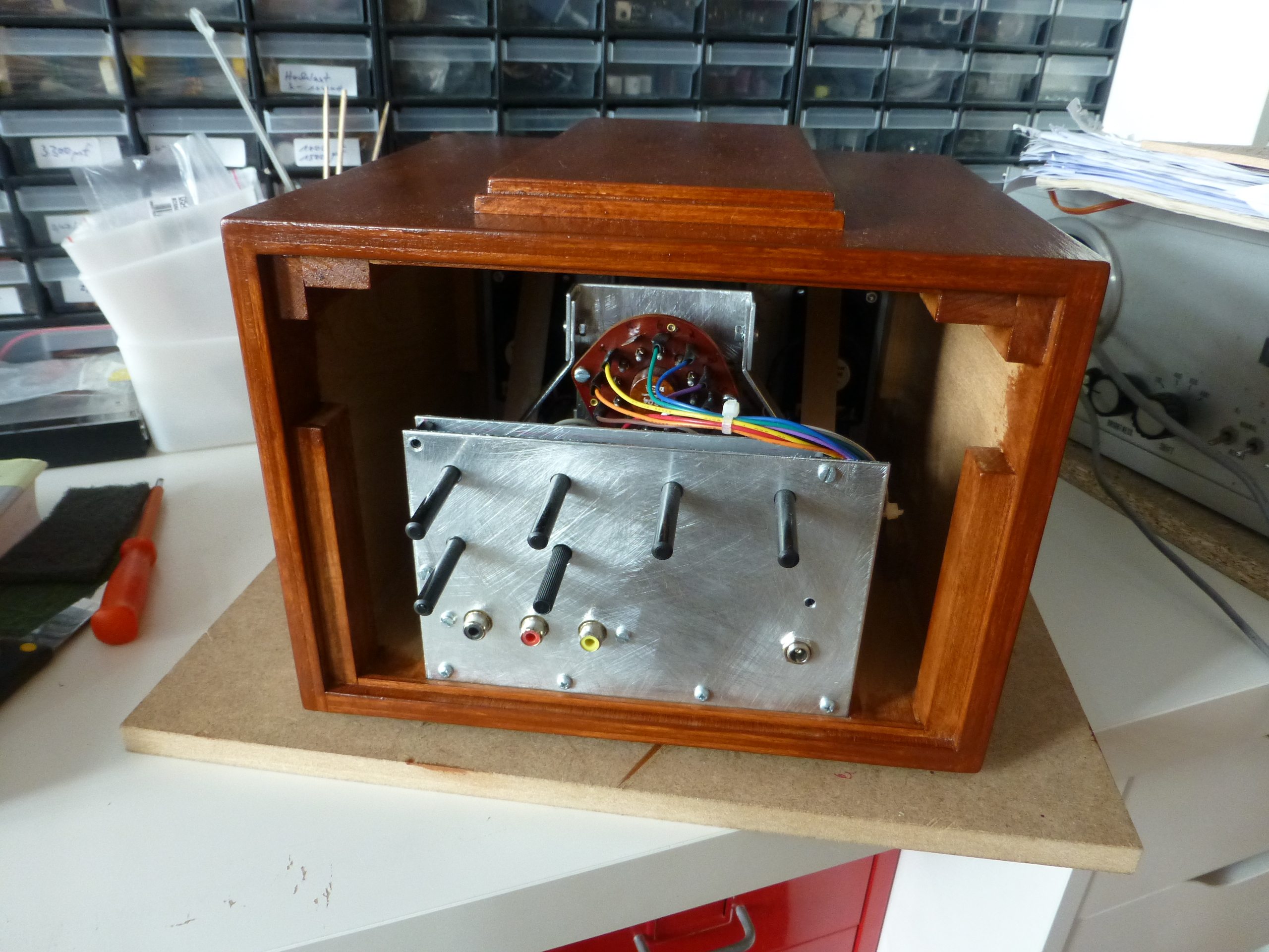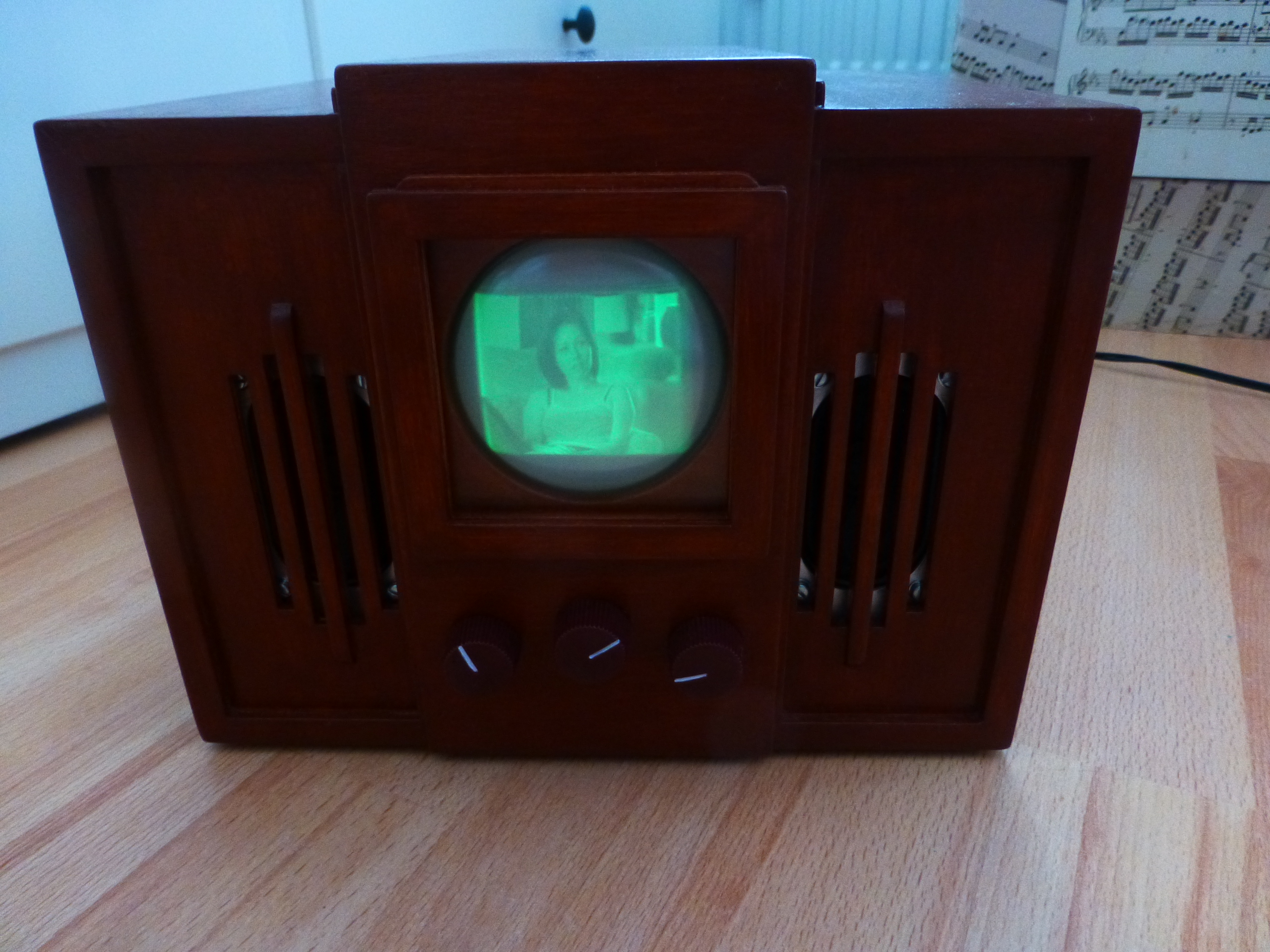 Dann sollte das ganz aber auch in ein Gehäuse und von Anfang an schwebte mir ein Aufbau vor, der sich etwas am Design der Pre- und Postwar TV Sets orientierte. Insbesondere dem einen oder anderen DIY KIT (z.B. der ARGUS). Also gibt es ein Chassis, dass die Elektronik und die "Bildröhre" trägt, welches dann in das Holzgehäuse eingeschoben wird. Ich finde, alles in allem, ist mir das ganz gut gelungen und war lehrreich. Klar kann man sich fragen ob bei der wenig überzeugenden und grünen Bildquali (ein Dauergucken macht keinen Spaß) dieser Aufwand gelohnt hat. Doch gehts beim Basteln ja selten darum, sondern ums Machen. Und das hat mit Recherche, Nachdenken, Ausdenken, Umsetzen wirklich Spaß gemacht!