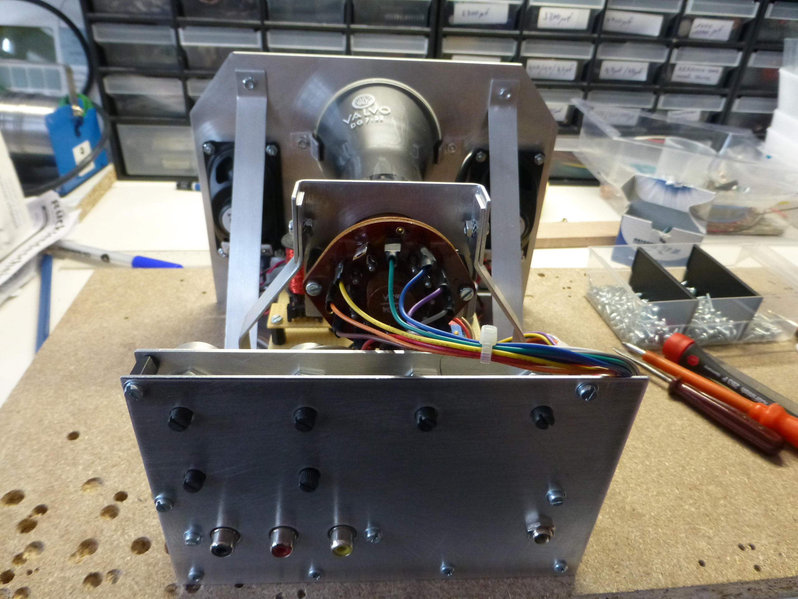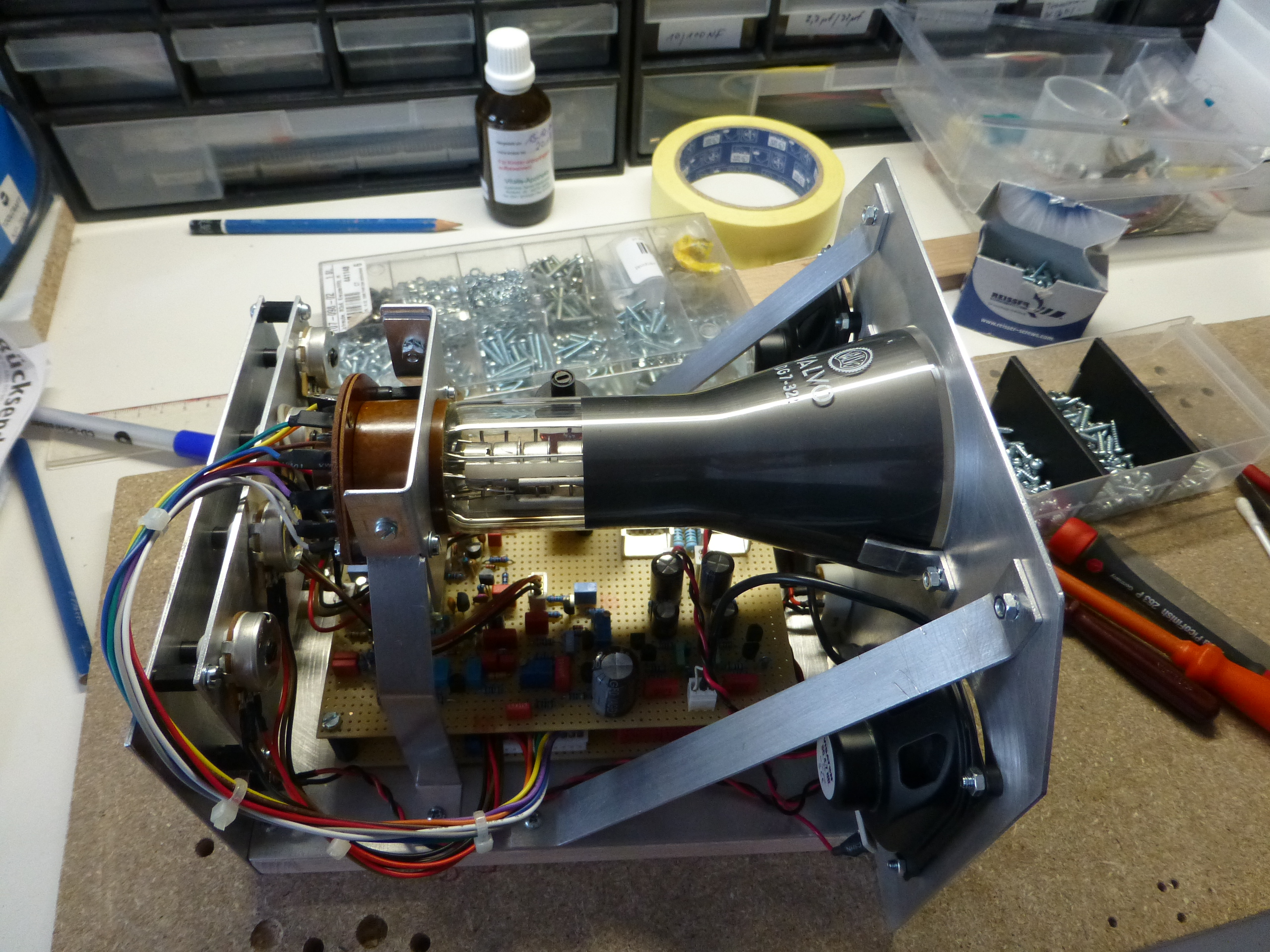 ....und hier ein Einblick ins Innere. Wirklich linear habe ich die Ablenkschaltungen nicht hinbekommen wie man sehen kann...