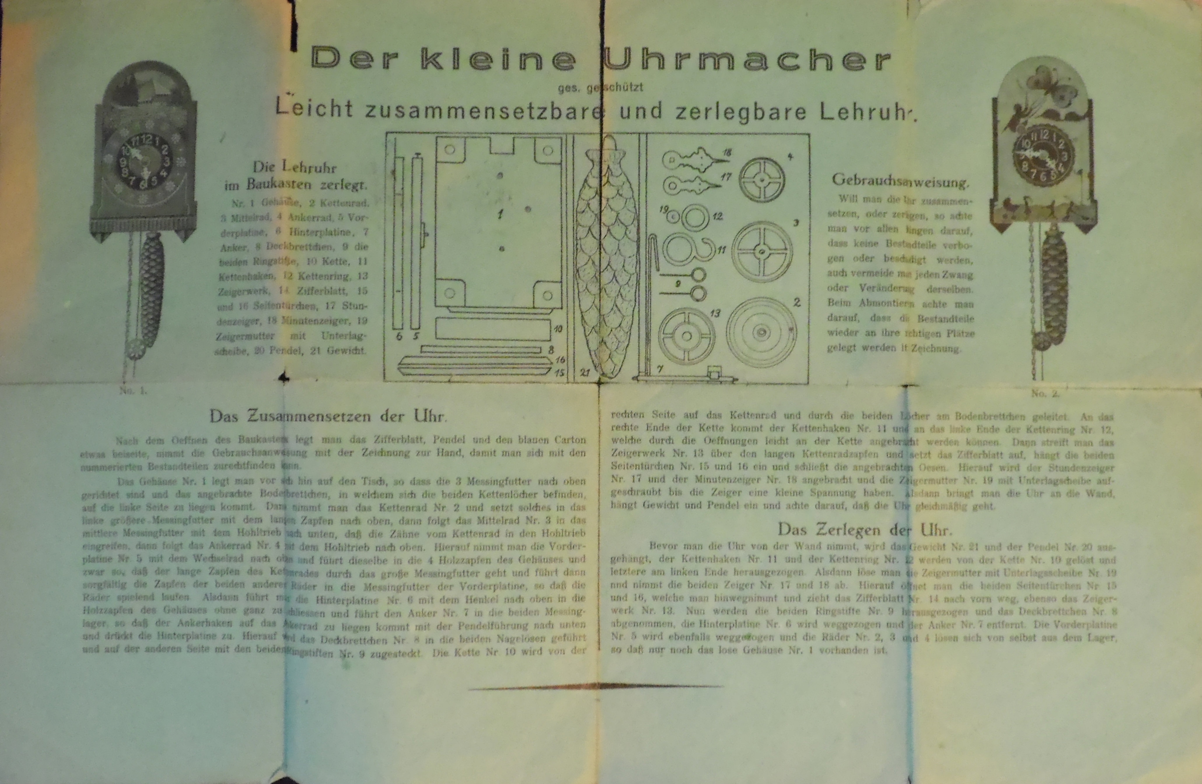 Der Kasten und das Uhrengestell sind komplett aus Holz (Uhrengestell entspricht einem sogenannten Schwarzwälder Jockele). Alle Uhrenteile sind komplett, im Originalzustand und die zusammensetzbare Uhr funktioniert. Es gab auch eine Variante mit Porzellanziffernblatt, dieses scheint jedoch sehr selten zu sein. Die Anleitung ist auch vorhanden aber sehr fragil, weshalb ich aus Sicherheitsgründen eine Kopie davon gemacht habe.
